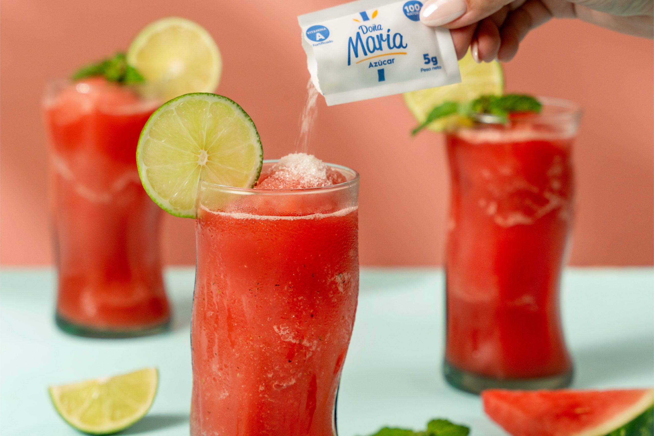- Hacé el sirope simple: en un tazón pequeño, colocá el Azúcar Doña María con el agua caliente. Revolvé vigorosamente hasta que el azúcar se disuelva por completo. Dejá que este sirope se enfríe.