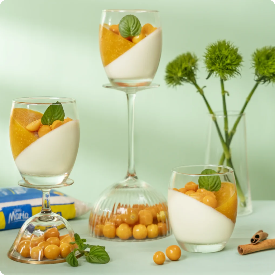 - una vez que las panacotas hayan enfriado y tengan una consistencia firme, colocales encima un poquito de la salsa de uchuvas y refrigerá por 1 hora más. Las podés servir con algunas uchuvas frescas encima y hojas de hierbabuena para decorar.